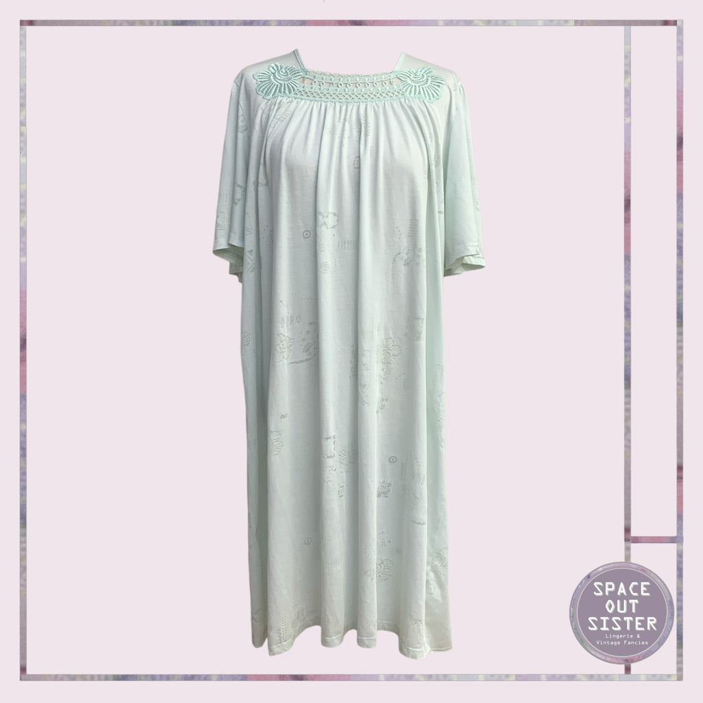 This lovely vintage nightdress features a lightly embossed fabric and a loose fit for maximum comfort. Crafted with a light green color, this nightdress is perfect for a peaceful night's sleep. Add a touch of elegance to your sleepwear collection with this vintage nightdress. As seen, a couple of stitches a little loose on neckline.