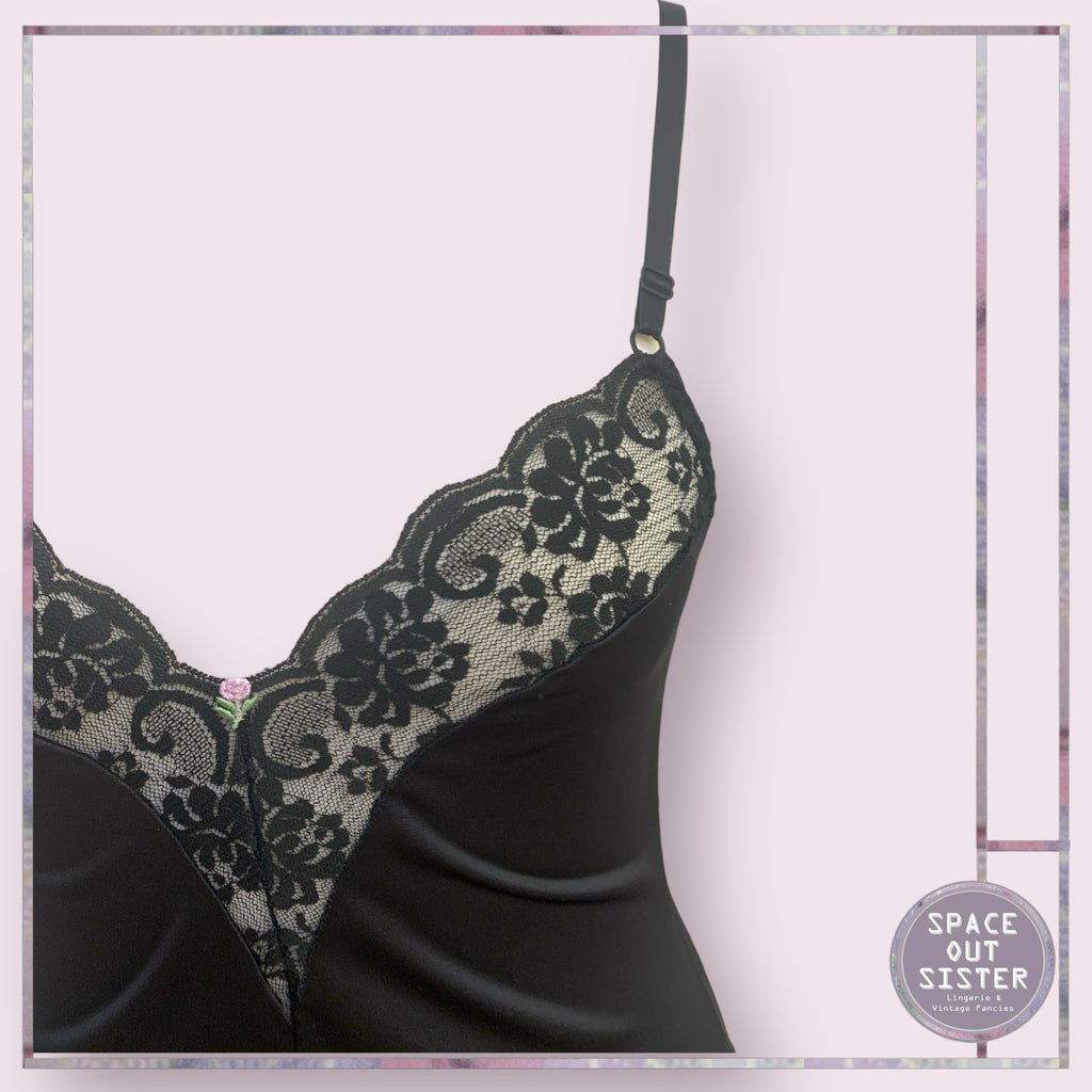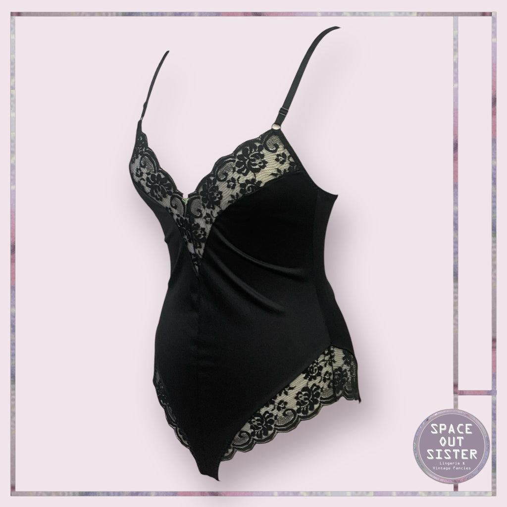 Slip into this vintage black satin bodysuit and channel your inner Hollywood starlet (or just feel fabulous at home). The lace trim adds a dash of elegance.