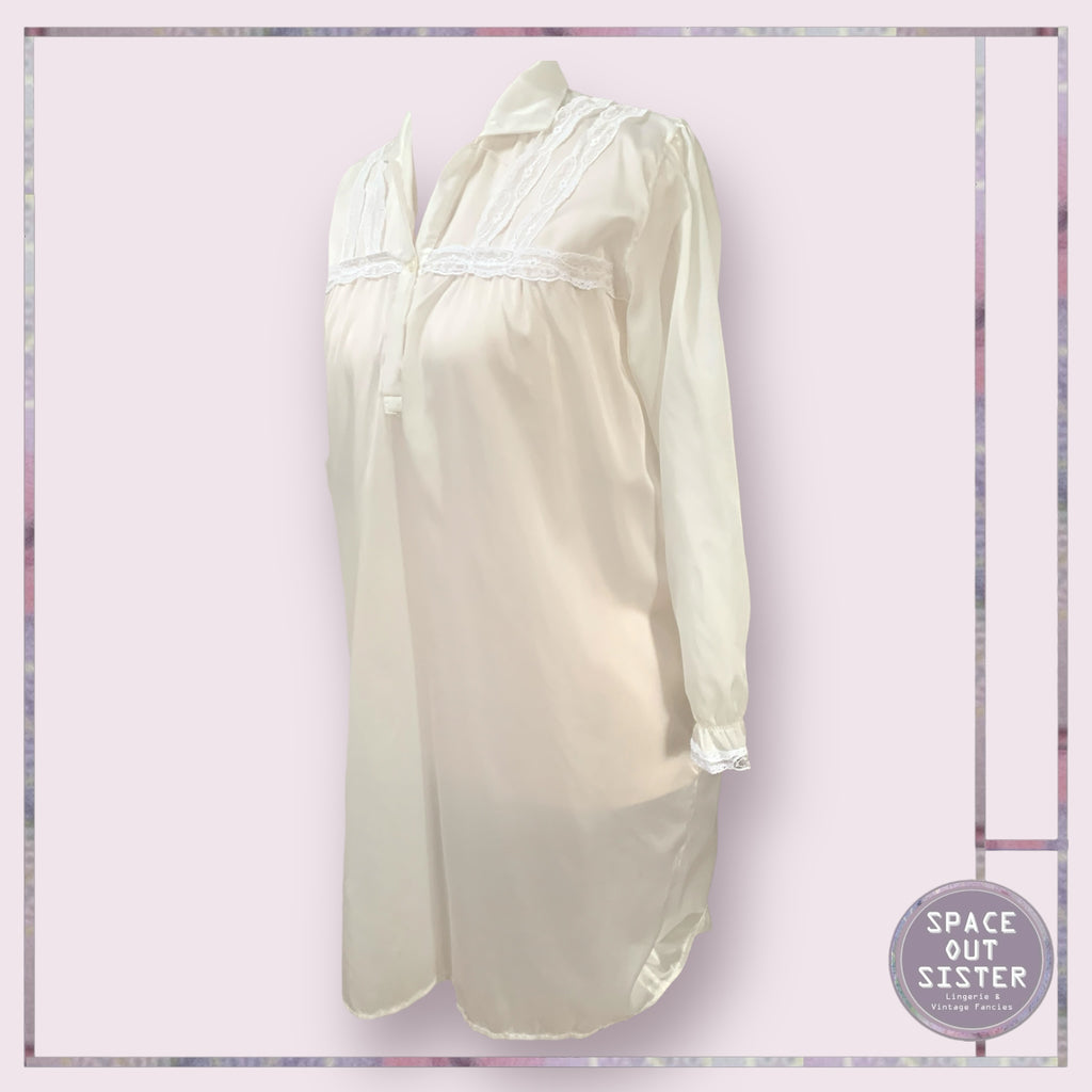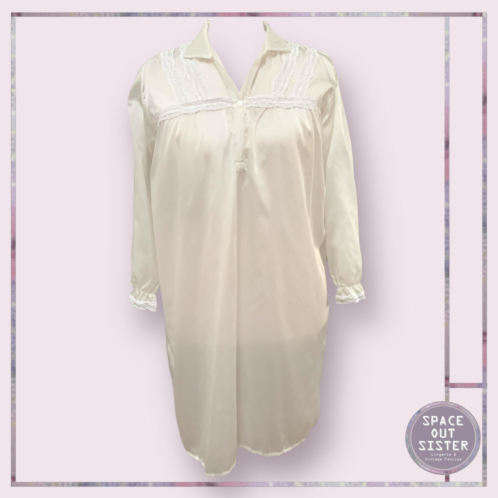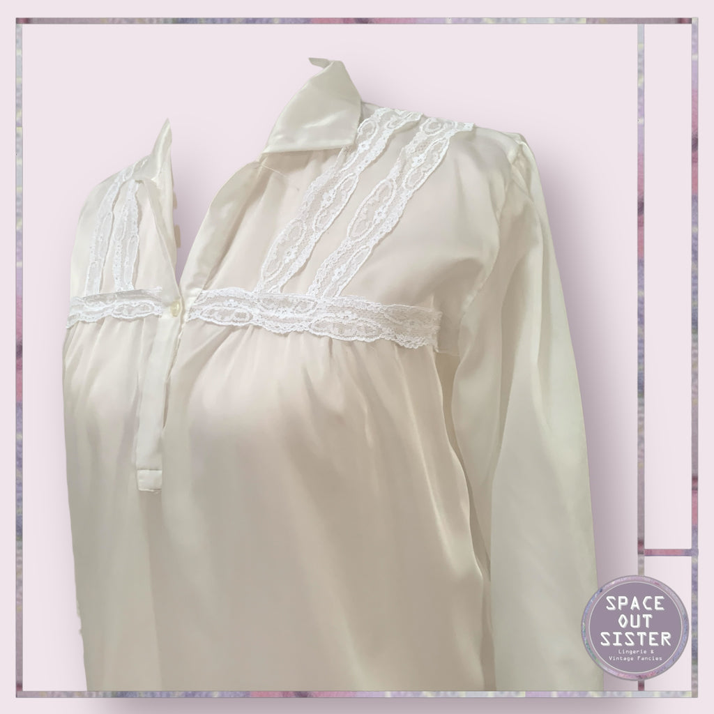 Slip into the Vintage Satin Confezoni Marisa Nightshirt and transform your bedtime routine into a glamorous affair! This dreamy white satin number is not just for sleeping; it's like wearing a cloud (one with lace and buttons). Get ready to snooze in style!