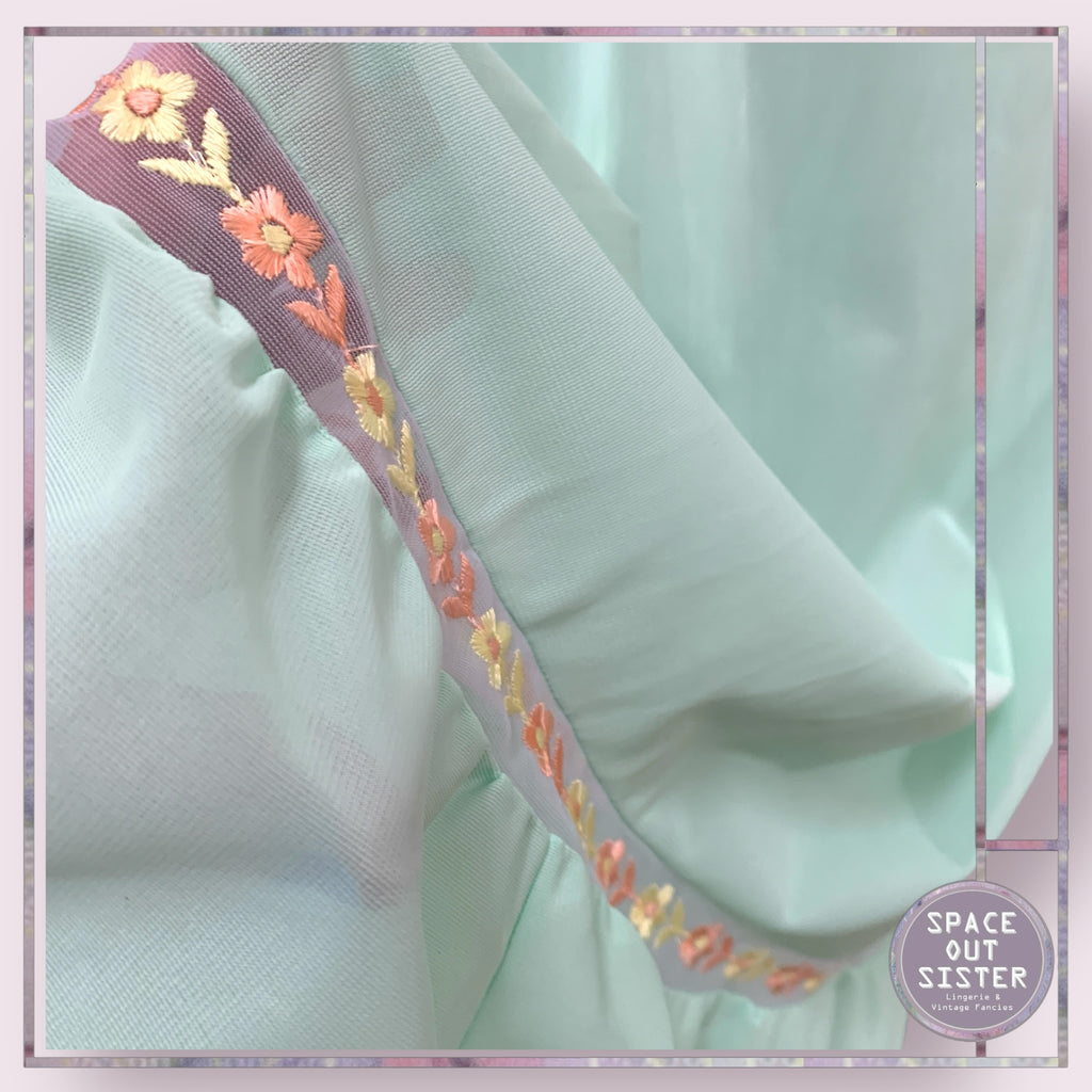 The NOS Vintage Mary Cassidy’s Half Slip features a bright green fabric adorned with orange floral lace at the hemline. This calf-length slip is a rare find, offering both elegance and comfort. Its design enhances layering options while ensuring a smooth silhouette under various outfits. As seen, please see last photo. A shop label mark to centre left at the waist line.