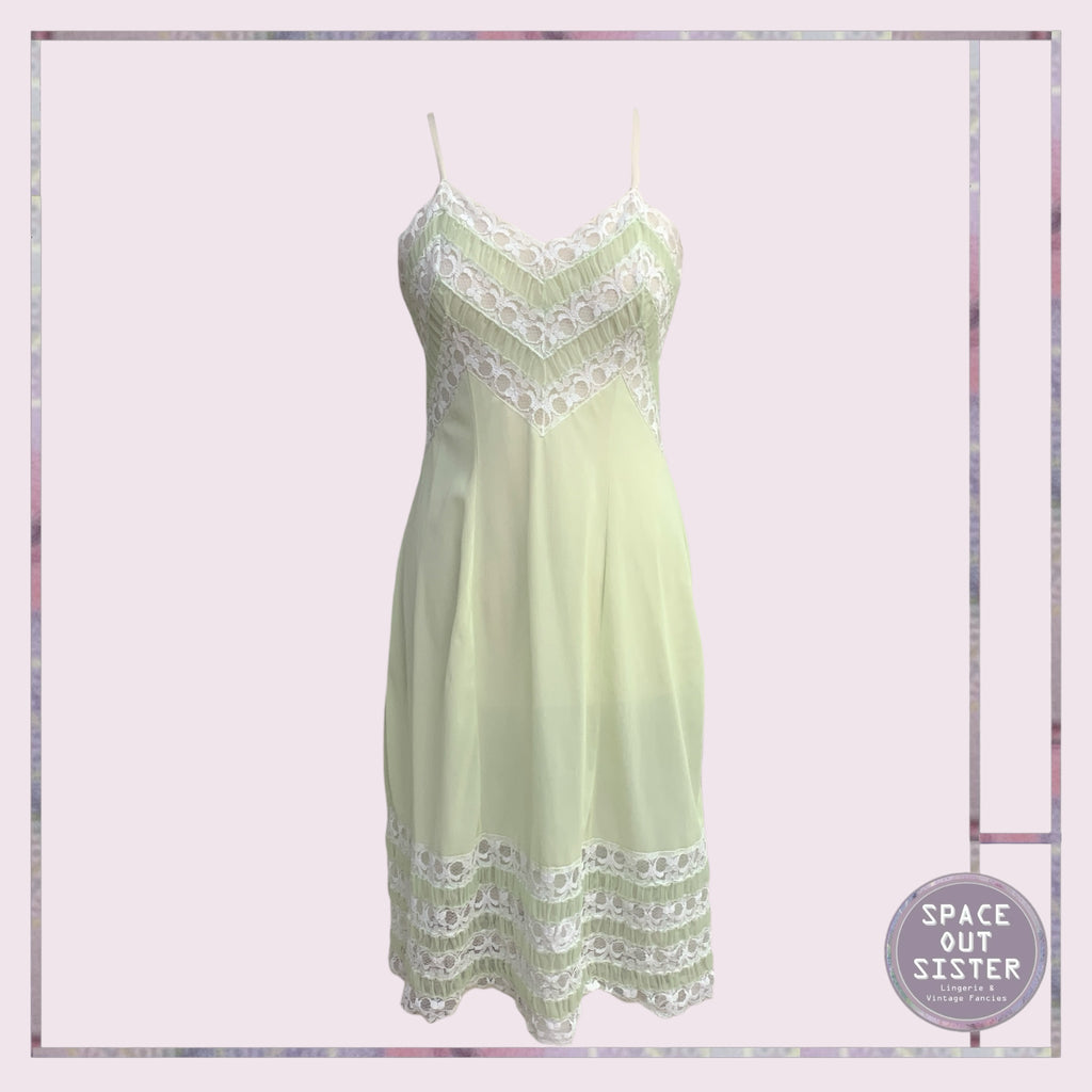 This stunning Vintage Light Lime Slip is truly one of a kind. The ornate design and beautiful light lime color make it a standout piece. The neckline and hemline add an elegant touch.