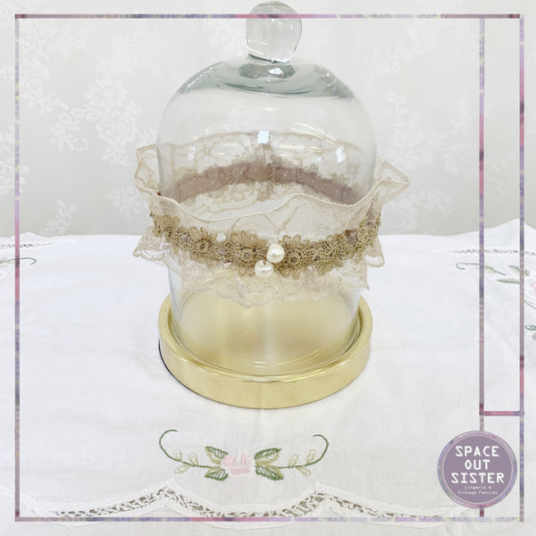 Handmade New Garter in champagne lace with taupe dotty rouleau. Gold floral lace adorned with two faux pearls to the centre front. Presented in a handmade matching sachet bag.