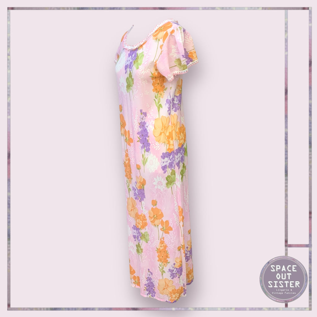 This vintage circa 1970s nightdress is a stunning piece with a printed design. Its semi-sheer fabric and short sleeves make it a perfect choice for a comfortable yet elegant night's sleep. Add a touch of vintage charm to your wardrobe with this full-length nightdress.
