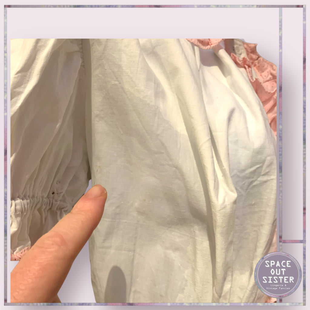 This vintage cotton nightdress features enchanting white fabric with charming pink polka dot ruffles. Exquisitely crafted, it offers a timeless appeal and is perfect for a comfortable and elegant nights sleep. As seen, some blemishes as last photos show.