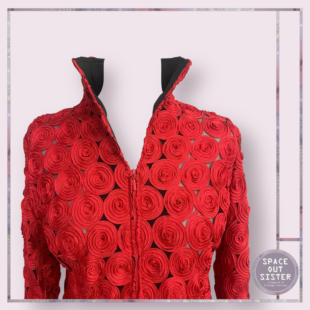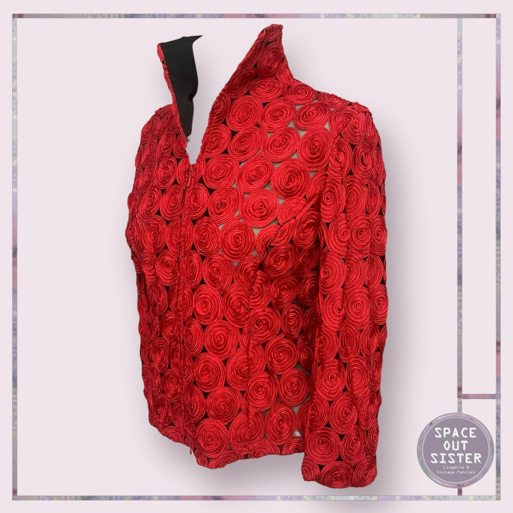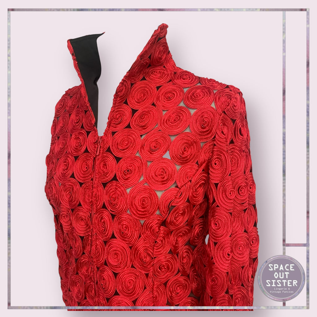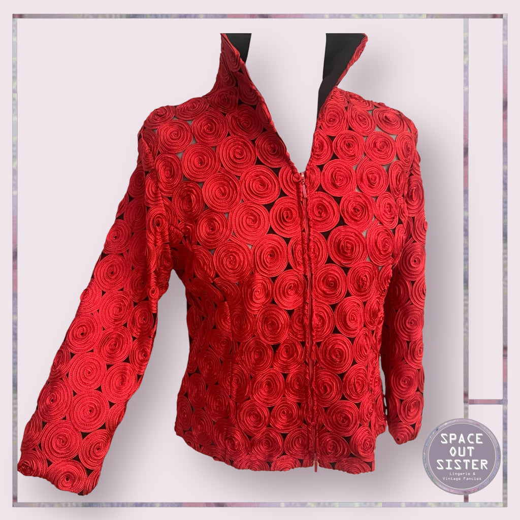 Expertly crafted in classic vintage style, the Vintage D&N Jacket boasts a striking semi sheer design in bold red and black. Complete with a convenient zip closure, this jacket exudes effortless style while providing practicality. Elevate your wardrobe with this statement piece.