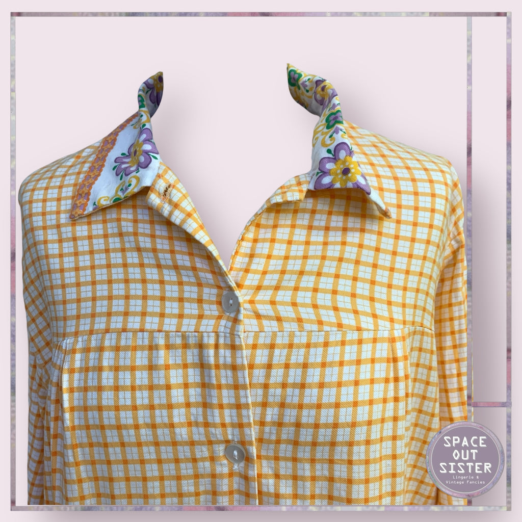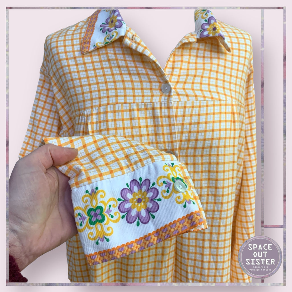 Unleash your inner vintage queen with our Vintage Grid Orange Nightdress! Made from soft cotton, this knee-length nightdress features full length sleeves with ornate floral cuffs for a touch of elegance. The vibrant orange plaid design adds a pop of color to your nightwear collection. A stunning find that is sure to become a favourite!