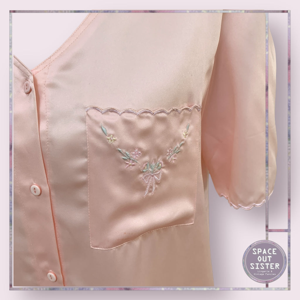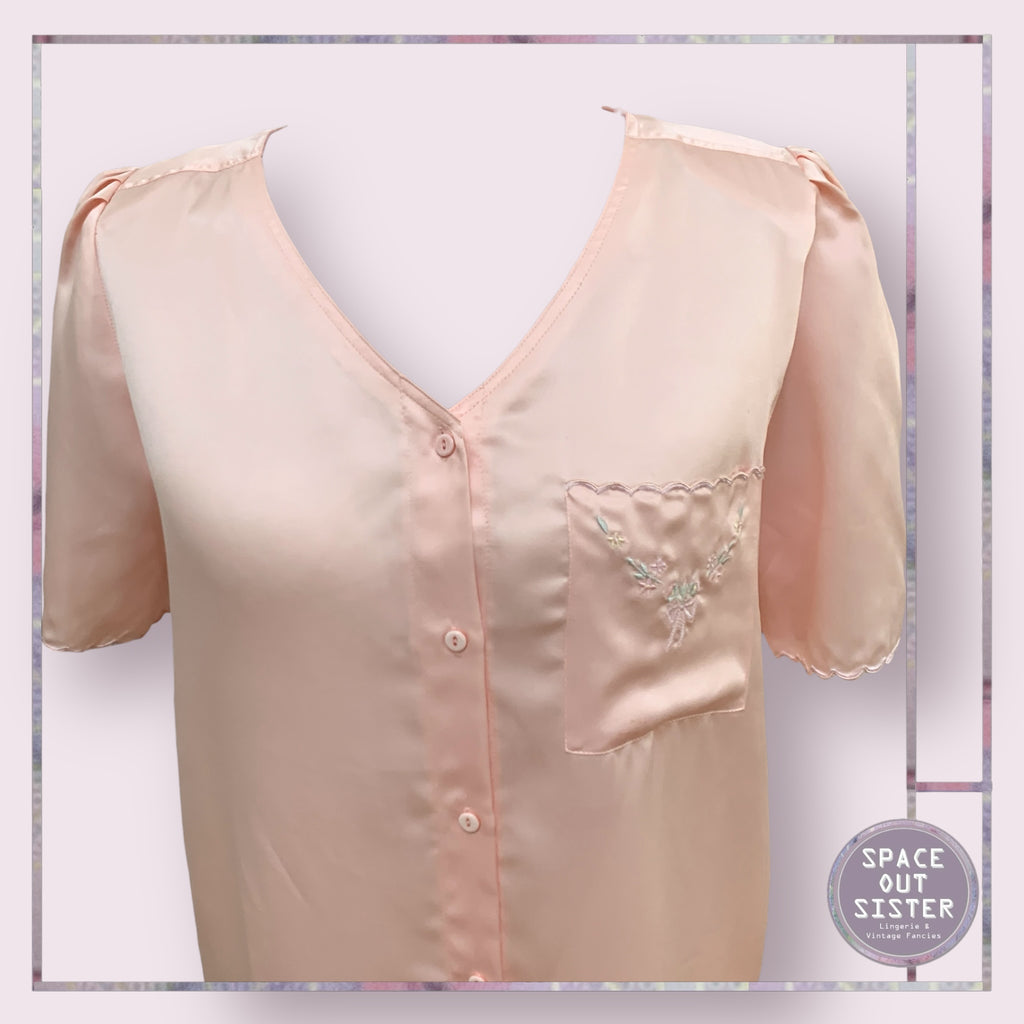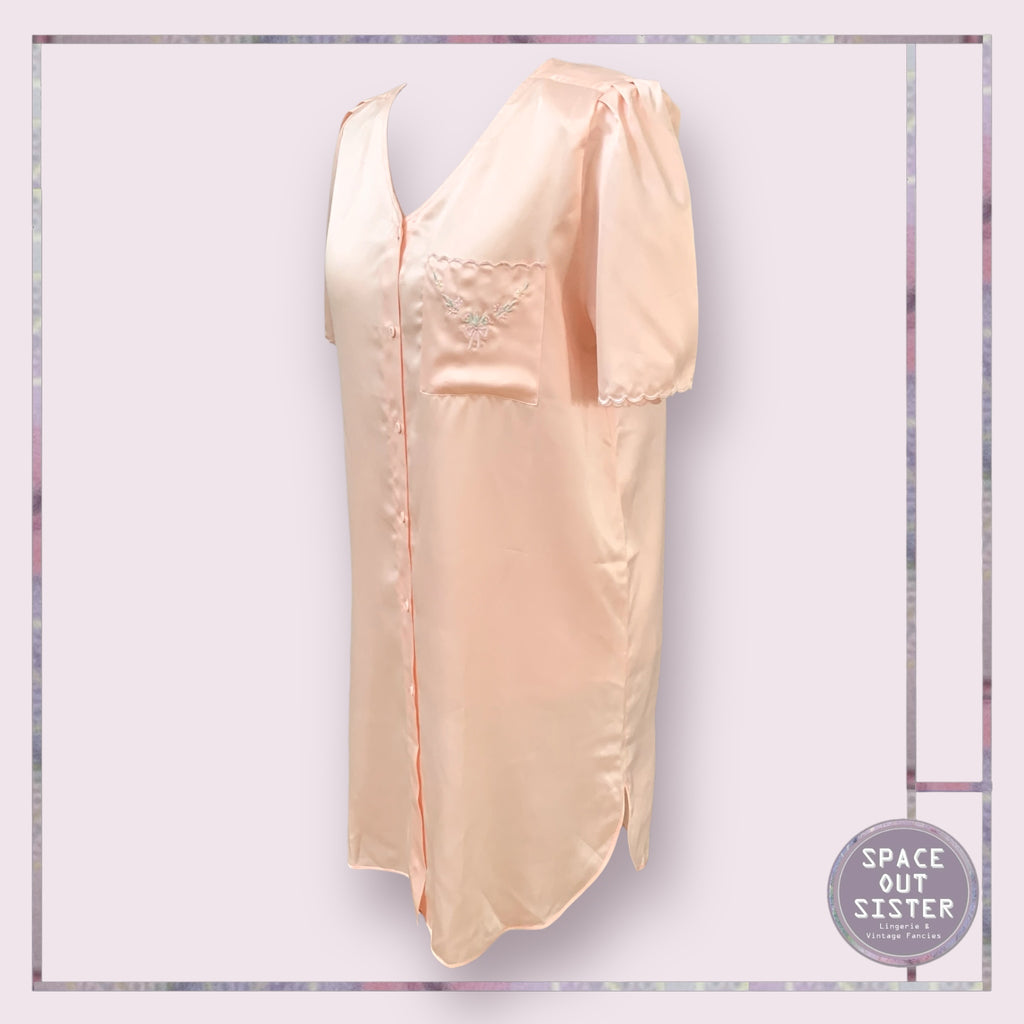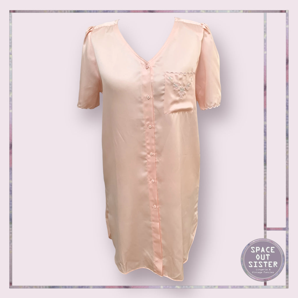 Step back in time with our Vintage Lord & Taylor Nightshirt. This circa 1980s piece features a soft v neckline, half sleeves, and sweet embroidery on the pocket. The knee-length design is both charming and comfortable, and the shoulder pads add a touch of vintage piece.