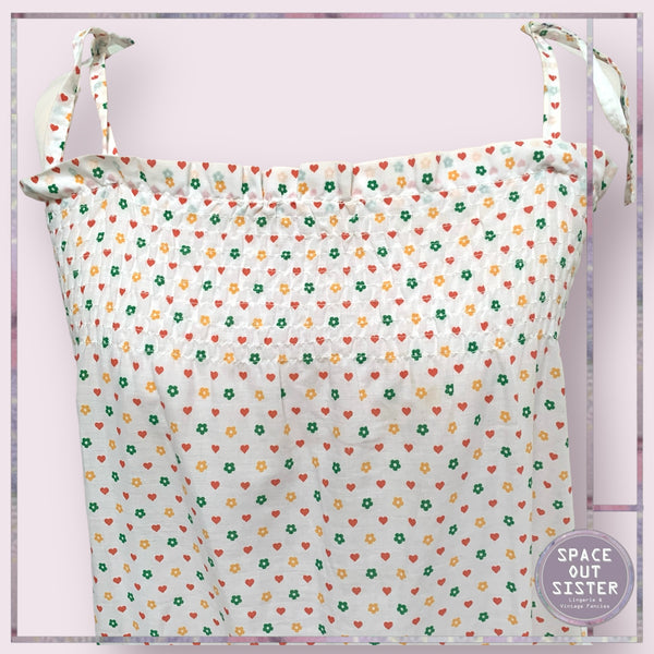 This Vintage Love Heart Smocked Nightdress is both sweet and comfortable. Made of soft cotton, the nightdress features charming love heart and figure designs at the hemline. The smocked bust area guarantees a perfect fit, with adjustable straps for added comfort. Get a good night's sleep with this lovely and stylish nightdress.