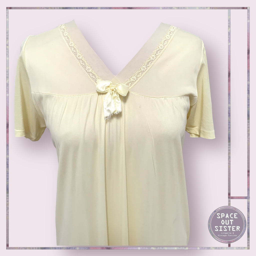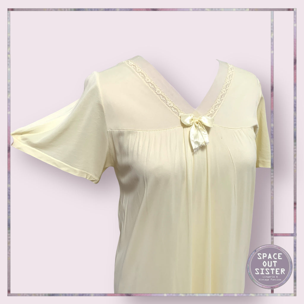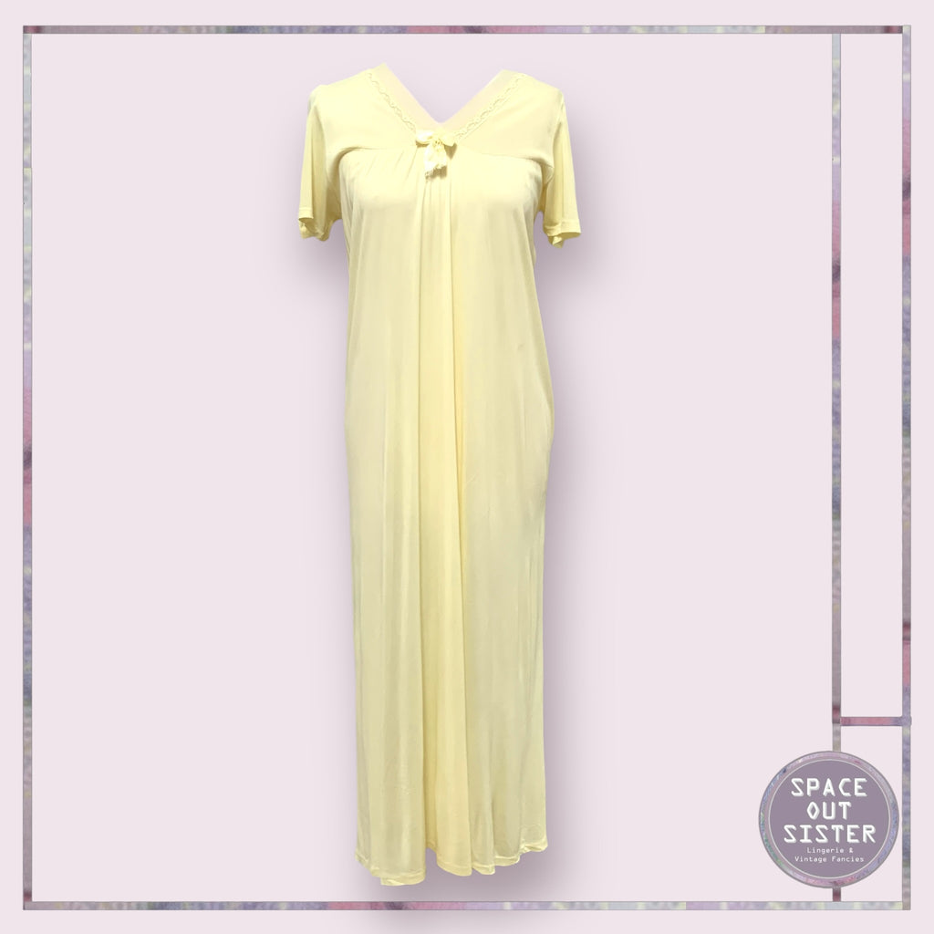Embrace the allure of nostalgia with the Vintage Mary Philmaid Lemon Nightdress, a sumptuous full-length gown crafted from exquisite tricot. This elegantly designed piece envelops you in a soft embrace, evoking timeless elegance while the vibrant lemon hue serves as a delicate reminder of warmth and light, creating a serene ambiance for your evenings. As seen, a couple of tiny blemishes.
