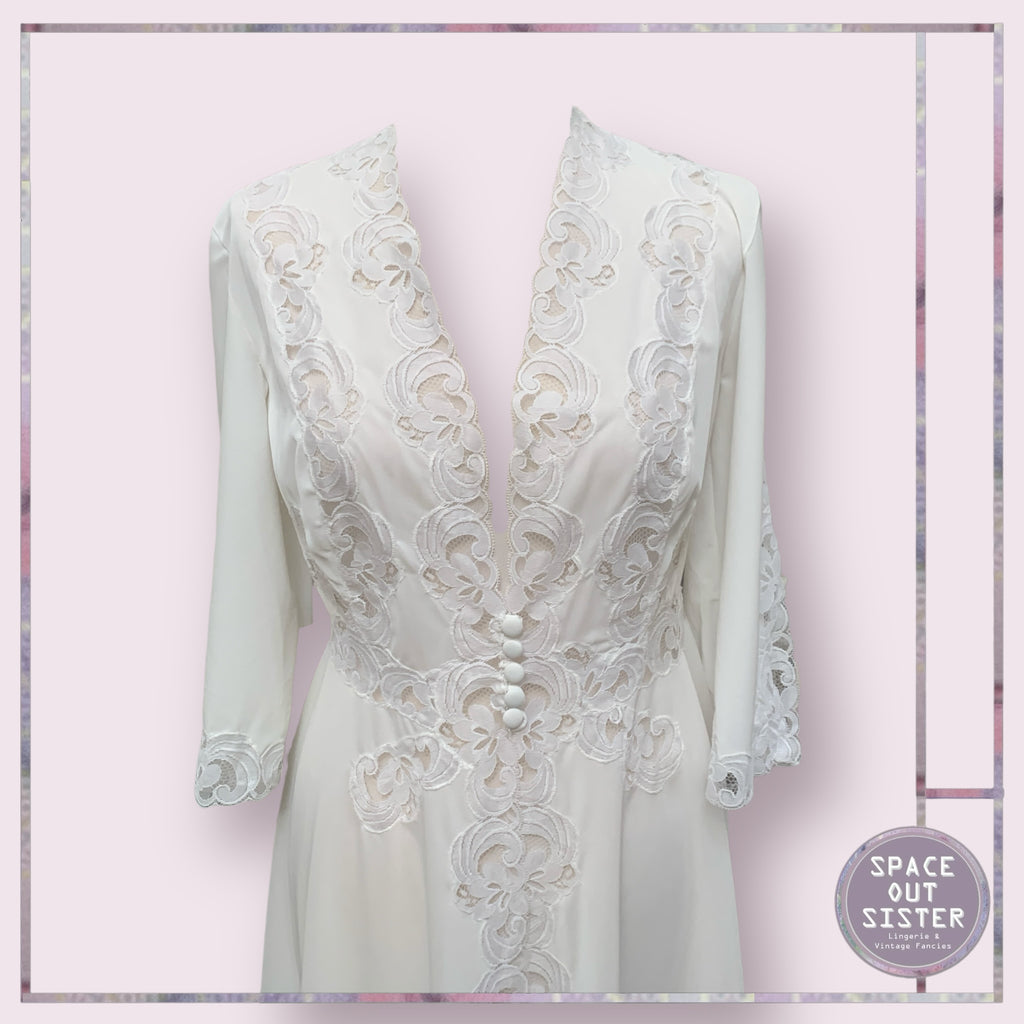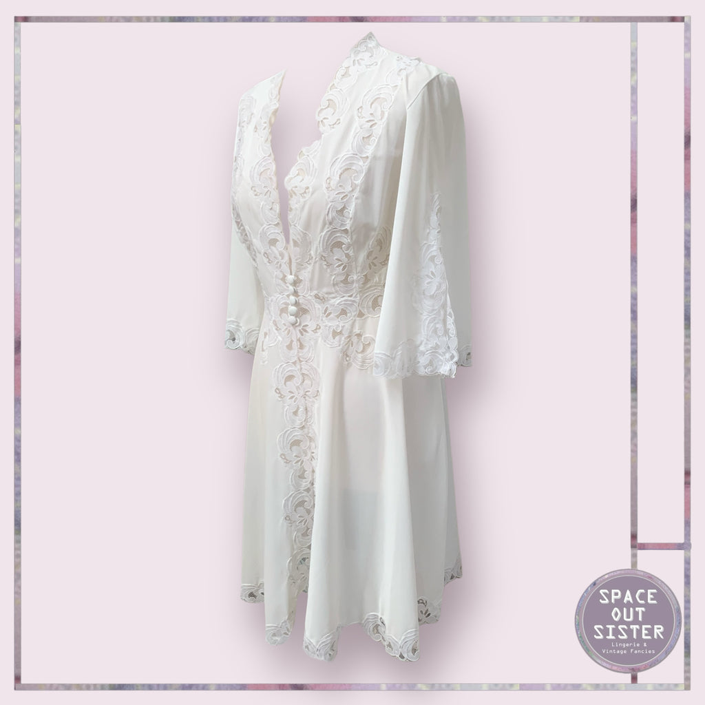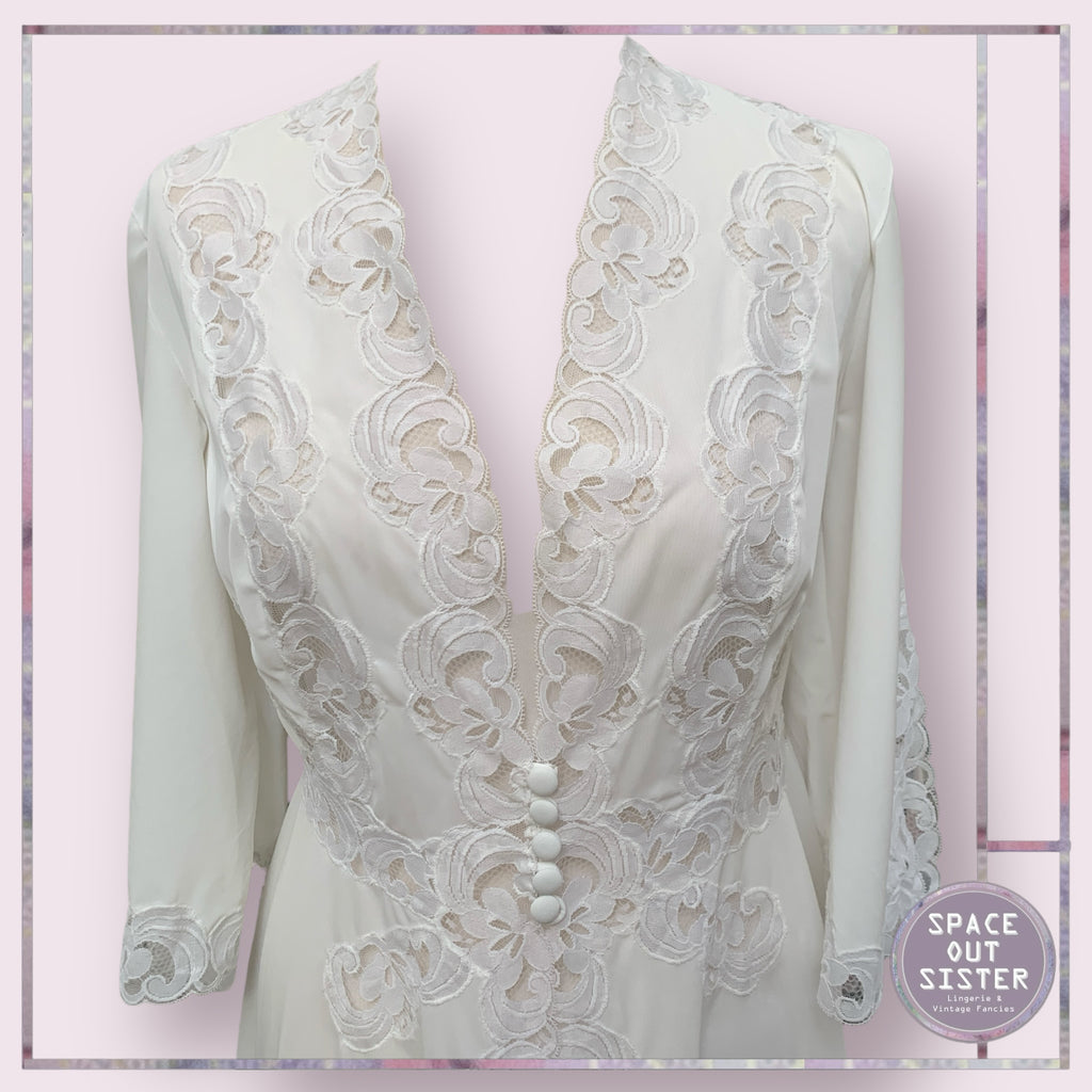 This Vintage Short White Negligee is a must-have for anyone looking for a beautiful and delicate piece. With intricate lace trim along the lapel and bust area, this negligee exudes elegance and femininity. The button fastening adds convenience to its charm. A true vintage treasure.