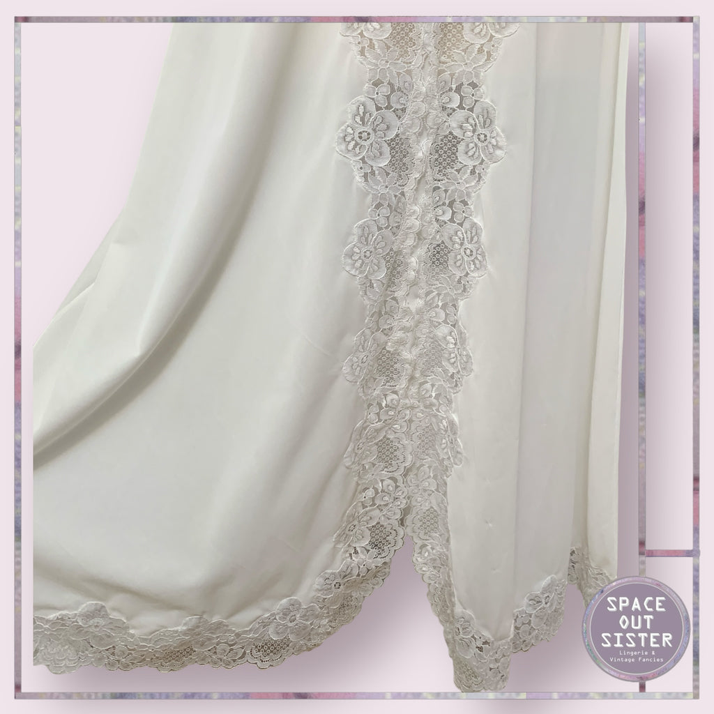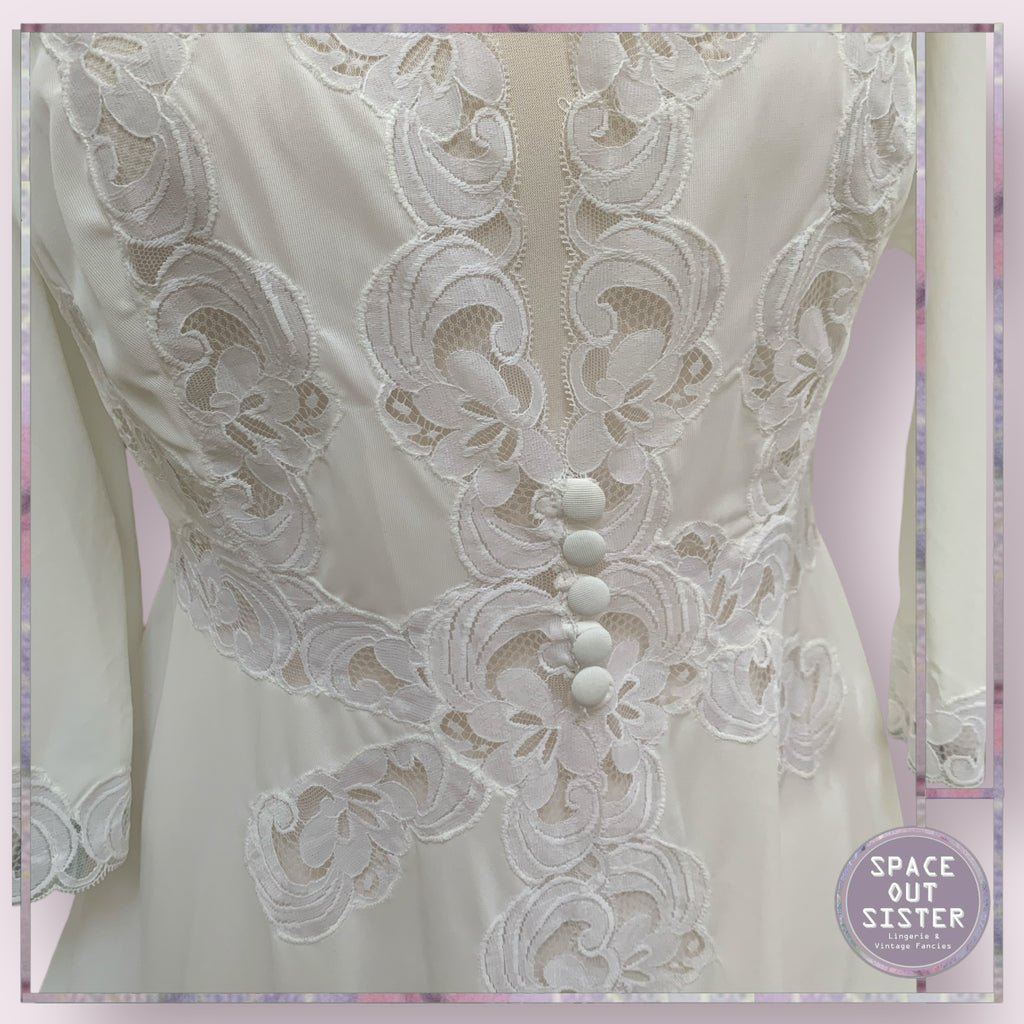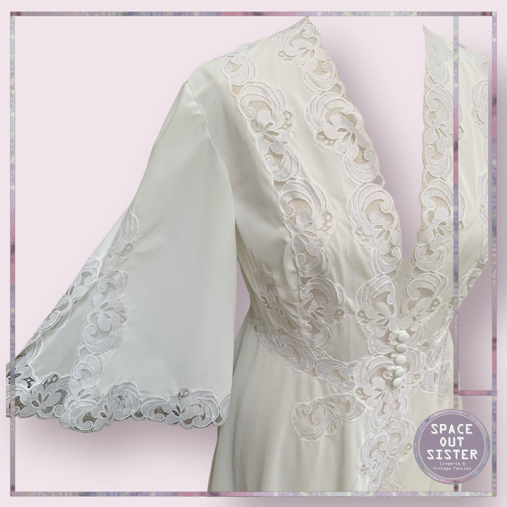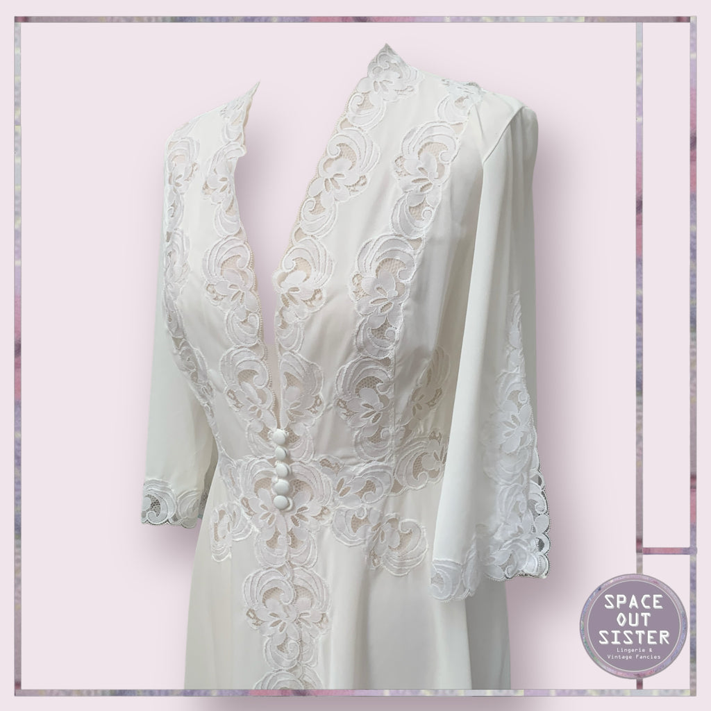 This Vintage Short White Negligee is a must-have for anyone looking for a beautiful and delicate piece. With intricate lace trim along the lapel and bust area, this negligee exudes elegance and femininity. The button fastening adds convenience to its charm. A true vintage treasure.