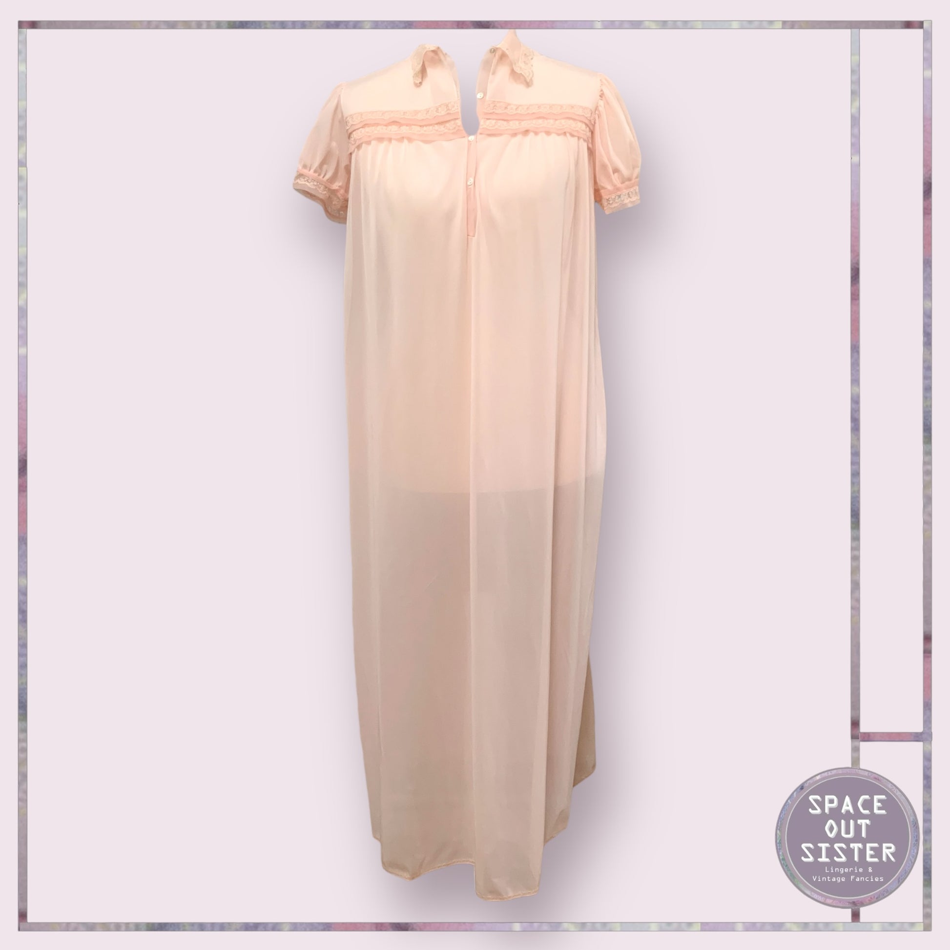 Enveloped in the delicate hues of barely-there peach, the Vintage Valisere French Charm Nightdress embodies an ethereal grace. Its ornate button front closure harmonizes with lace delicately entwined around the neckline and collar, creating an exquisite silhouette that whispers of timeless elegance and romantic allure. Embrace the night in this enchanting garment, a sublime tribute to the art of languid luxury.